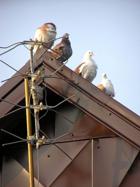 Przy założeniu, że otoczenie na to pozwalało, dlaczego nie skupiłeś się właśnie na gołębiach. IMHO można było (jeszcze raz zaznaczam jeśli warunki na to pozwalały) obejść dom i zrobić zdjęcie gołębiom na tle nieba z połacią dachu w kadrze. Pozbywasz się w ten sposób anteny, nieciekawej blachy (która BTW zasłania dwa gołębie z lewej, choć to mniej ważne bo antena zasłania dwa z prawej). Ale Ty uparłeś się że ściana domu obita blachą z przyczepioną anteną jest lepsza.