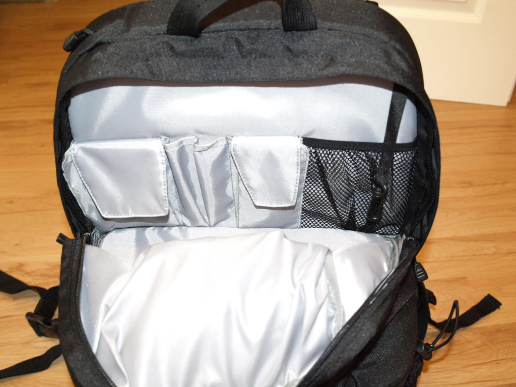 Zacznę od najważniejszej komory na sprzęt fotograficzny. Mamy możliwość dzielenia jej przegródkami w zależności od potrzeb. Na sam aparat z zamocowanym szkłem (u mnie: E620+ ZD 12-16 z osłoną przeciwsłoneczną) przeznaczamy najważniejsze miejsce obok klapy szybkiego dostępu. W pozostałe miejsca wpychamy obiektywy, ładowarki, drobne przedmioty. Mieści się też lampa (FL-36R, ale „pięćdziesiątka” też by weszła), kilka szkieł – jak widać na zdjęciach.