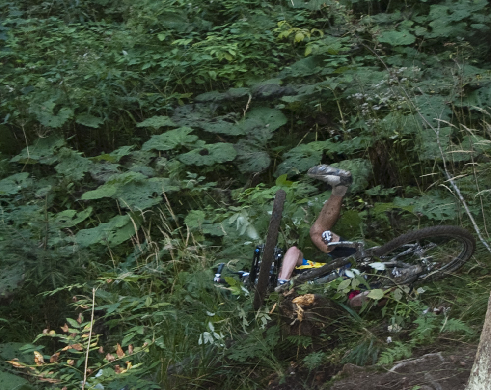 W tym miejscu dostałem nagle z paru lamp w oczy i stanąłem jak wryty. Na specjalne życzenie cofnąłem się i próbowałem zjechać po tych wyślizganych korzeniach. Za późno wziąłem się w tym roku za długie dystanse, w przyszłym roku się poprawię