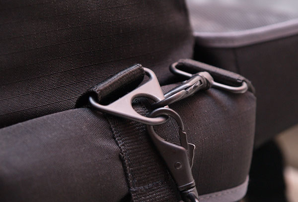 Nad kieszeniami znajdują się zaczepy paska oraz plastikowe zatrzaski do zamknięcia górnej klapy. Zaczepy paska są wykonane z solidnego metalu i są zamontowane na stałe - nie ma żadnych karabińczyków, nie ma możliwości odczepienia metalu od torby ani paska od zaczepów: