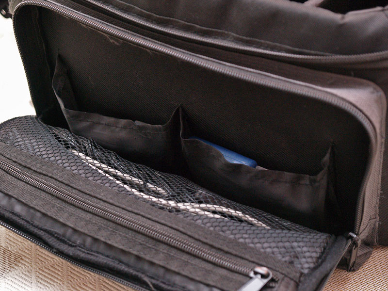 Przednia kieszeń to miejsce przechowywania zapasowych kart pamięci, zapasowych baterii czy np. jak w moim przypadku pędzelków. Kieszeń ta posiada trzy przegródki, do każdej z nich mieści się spokojnie zapasowy BLM. Przednia, siatkowa część umożliwia przechowywanie zapasowych kart CF. Po lewej stronie przegródek miejsce do wsunięcia np. długopisu, w przedniej części kieszeni dodatkowy przezroczysty schowek zamykany zamkiem błyskawicznym.
