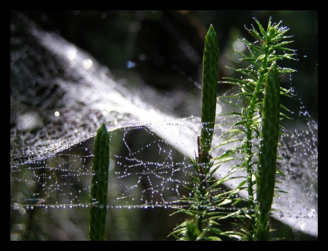 Koncepcją było pokazanie obrazu "widzianego" oczami małego stworzonka pod pajęczynami mchów itp. W Polsce nie ma takich olbrzymich mchów żeby można było włożyć pod nie aparat więc musiały to być widłaki. Pracuję w Lasach Państwowych więc nietrudno mi było znaleźć takie cudeńka. Do tego potrzebne było jeszcze: ładna pogoda zaraz po deszczu i dużo cierpliwości. Wyznaję zasadę, że nie niszczę fotografowanych roślinek a szczególnie takich cennych, więc musiałem się nagimnastykować zanim chwyciłem w miarę dobre ujęcie bo zabranie widłaków do domu nie wchodziło w rachubę. Nie mam żadnych fotoshopów itp. więc za dużo nie kombinowałem przy fotkach, za wyjatkiem lekkiego rozjaśnienia niektórych.Zamieszczone przez nib