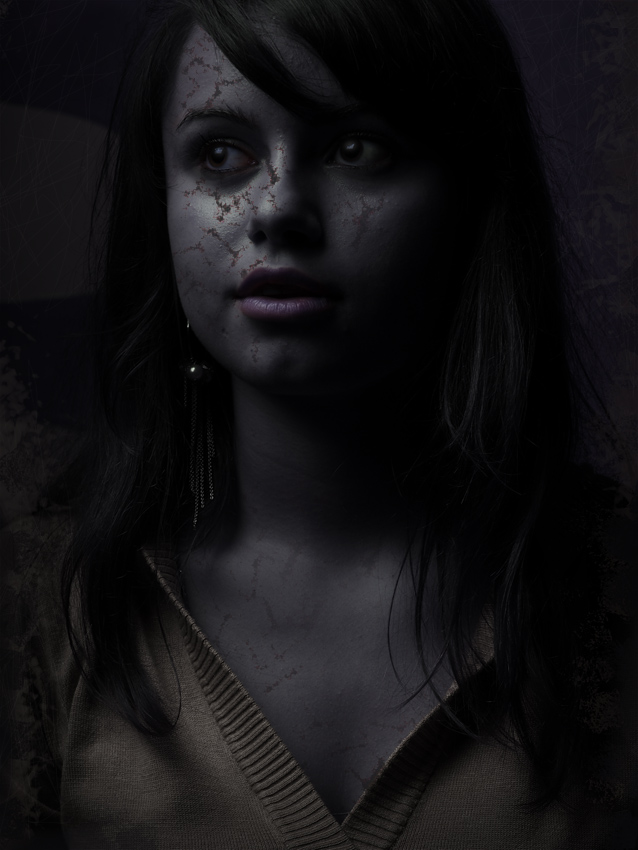 Modelka jest pokryta w jakimś nieznanym dla mnie celu marmurkową powłoką, ale ja to pomijam - fotka jest wypracowana, światło pięknie modeluje twarz, oczy błyszczą, cienie grają (włosy sa ciemne na tle ciemności, ale widoczne, profil głowy przez to nie jest zagubiony) , kolczyk dyskretnie połyskuje, dekolt ładnie się prezentuje, na twarzy odwaga i niepewność, zamiar i porażka.