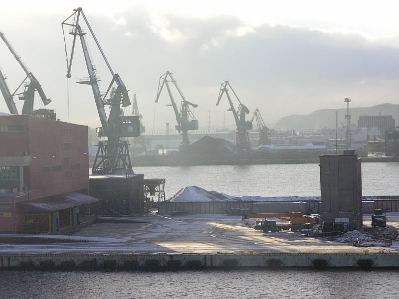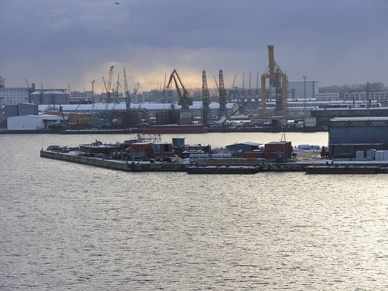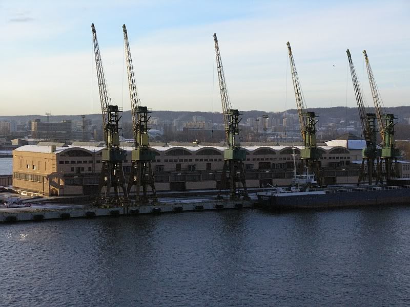 Ogolnie rzecz biorąc, to w porcie bardzo niechętnie widzą fotografów. Z poziomu wody można by wykonać fotki tylko w jednym przypadku - zatrudnić się w porcie na zlecenie przy takich pracach, które wymagają pływania motorówką, ale to jest właściwie niemozliwe, poniewaz pływanie motorówka po porcie, to jest bardzo wielkie halo, tam ruch jest niezwykle ściesle reglamentowany i właściwie coś takiego występuje tylko w sytuacjach awaryjnych. Byłem zatrudniany w porcie do innych prac, ale wtedy jest do dyspozycji widok tylko z nabrzeża, które ma okolo 3,5m do poziomu wody i z ktorego widać tylko przeciwległe nabrzeże, czyli nie za bardzo atrakcyjny widok. Z poziomu wody ujęcia by były bardzo atrakcyjne, gdyby mozna było dopłynąć w dowolne miejsce, stosownie do zapotrzebowania fotografa i srzelić kilkanaście kółek na wolnych obrotach, czasie jednego obrotu motorówki. Można fotografować tylko z promów zawijających do portu lub statku turystycznego. Statek taki wożący ludzi w celu zwiedzania portu kursuje tylko wg rozkładu i po ustalonej trasie ze stosunkowo dużą prędkością nie pozwalającą na przemyślenie kadru - trzeba decydować w ciągu kilku kilkunastu sekund o zdjęciu. Najłatwiej mają pracownicy portowi pływający na pilotówkach , holownikach i innych technicznym taborze, jeżeli umieją fotografować, to mają duże szanse na zrobienie ładnych ujęć.