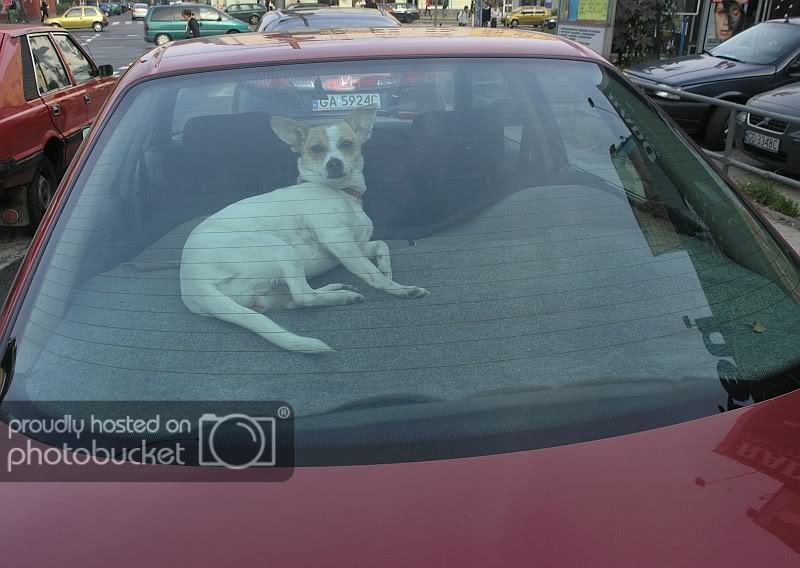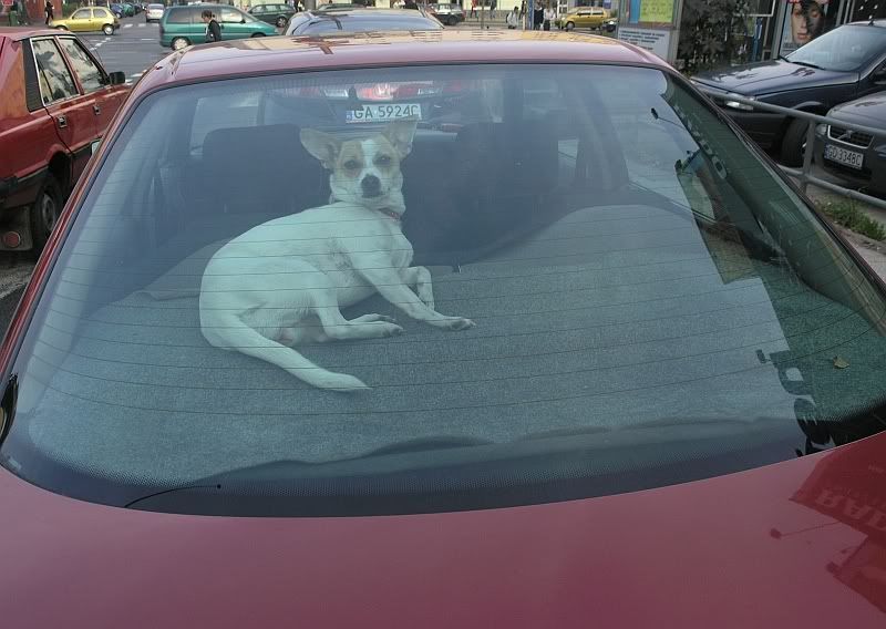 Ciekawą perspektywę tworzy maska samochodu z szybą, za którą leży piesek. Dodatkowo, jak napisałeś, ta szyba odgradza pieska od świata pełnego samochodów, ruchu i zgiełku - a on tam leży jak Rzymianin podczas biesiady. Wygrany kontrast sytuacyjny.