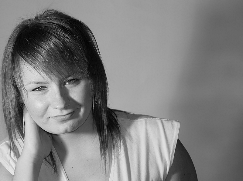 Przy takiej pozie dziewczyny (przechylona głowa) osobiście wykadrowałbym ją centralnie bez ucinania ramienia. Ale to indywidualna sprawa.