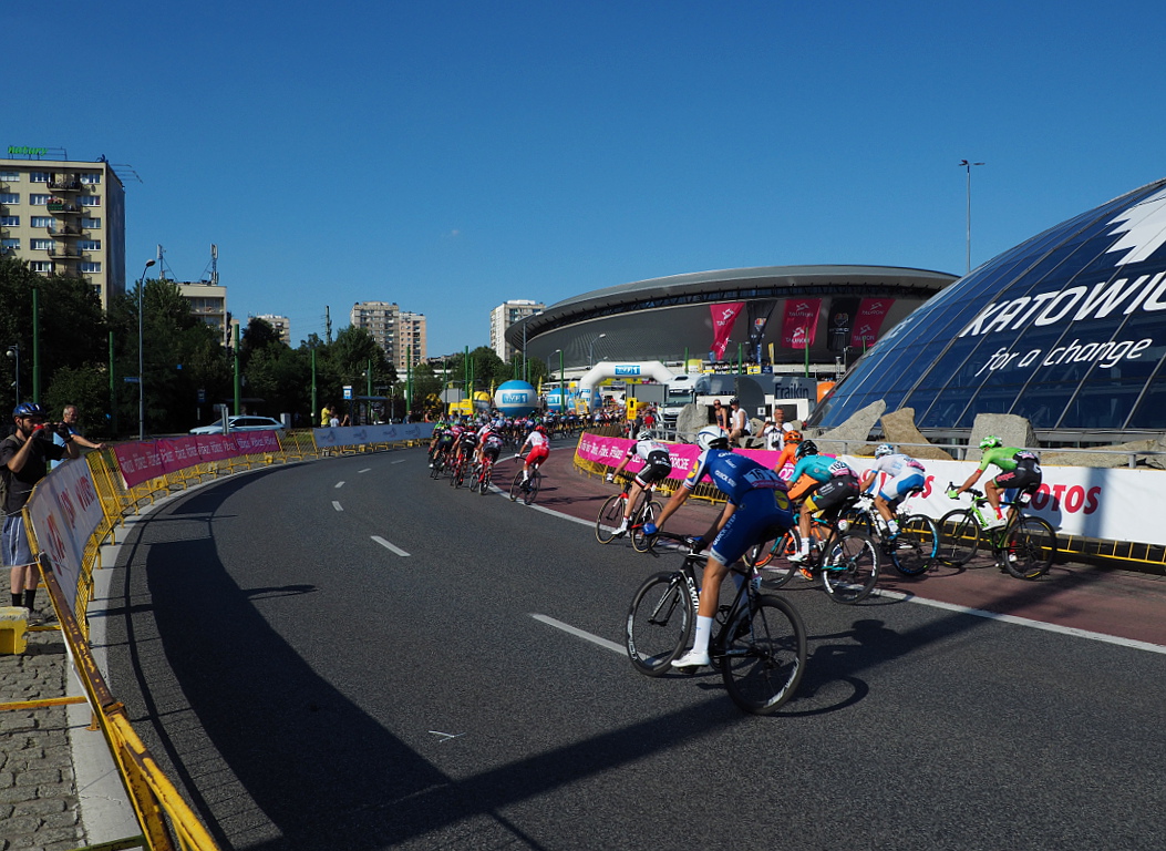 Zanim jednak kolarze pojawili się na trasie w Katowicach, pojawili się młodzi kolarze uczestniczący w takim małym wyścigu Mini Tour. Kilka więc fotek najpierw z tego wydarzenia. Plac przed Spodkiem wypełniony sponsorami, reklamami.