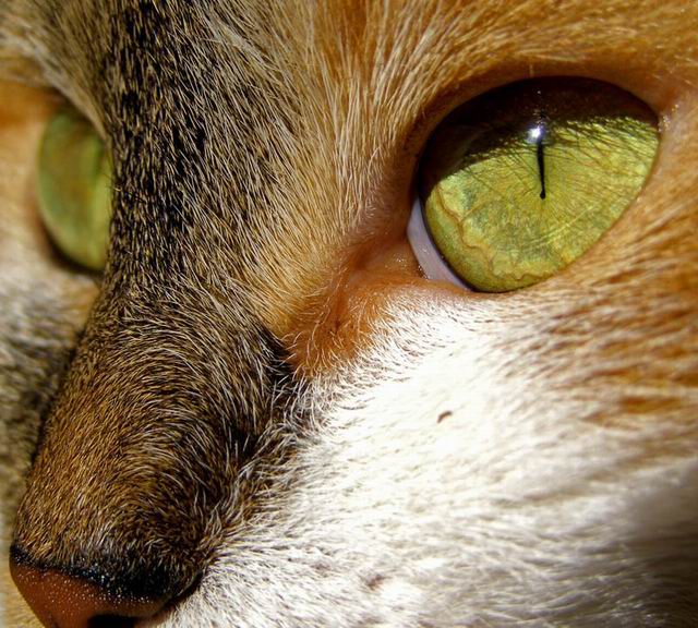 Trojka taka sobie... Niby mozna wejrzec gleboko w oczy kota, ale po pierwsze najpierw ogladamy dwa zdjecia B&W i szybkie przejscie na kolor jest nieprzyjemne, zle sie to oglada, a po drugie ten blik jednak mocno razi. Trzeba by go usunac na kompie.