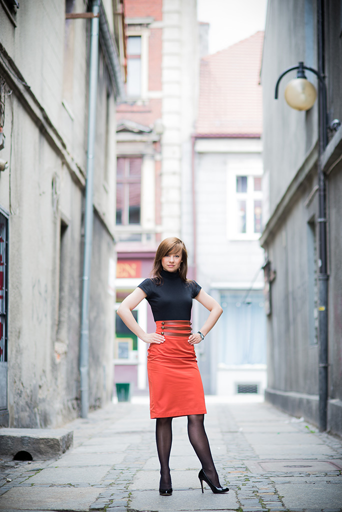 Osobiście bym skadrował tak, żeby bardziej skupić się na ani, teraz uliczka trochę ją przytłacza, a zdjęcie jest pozowane tak, że Ania aż się prosi by była maks na pierwszym planie.
