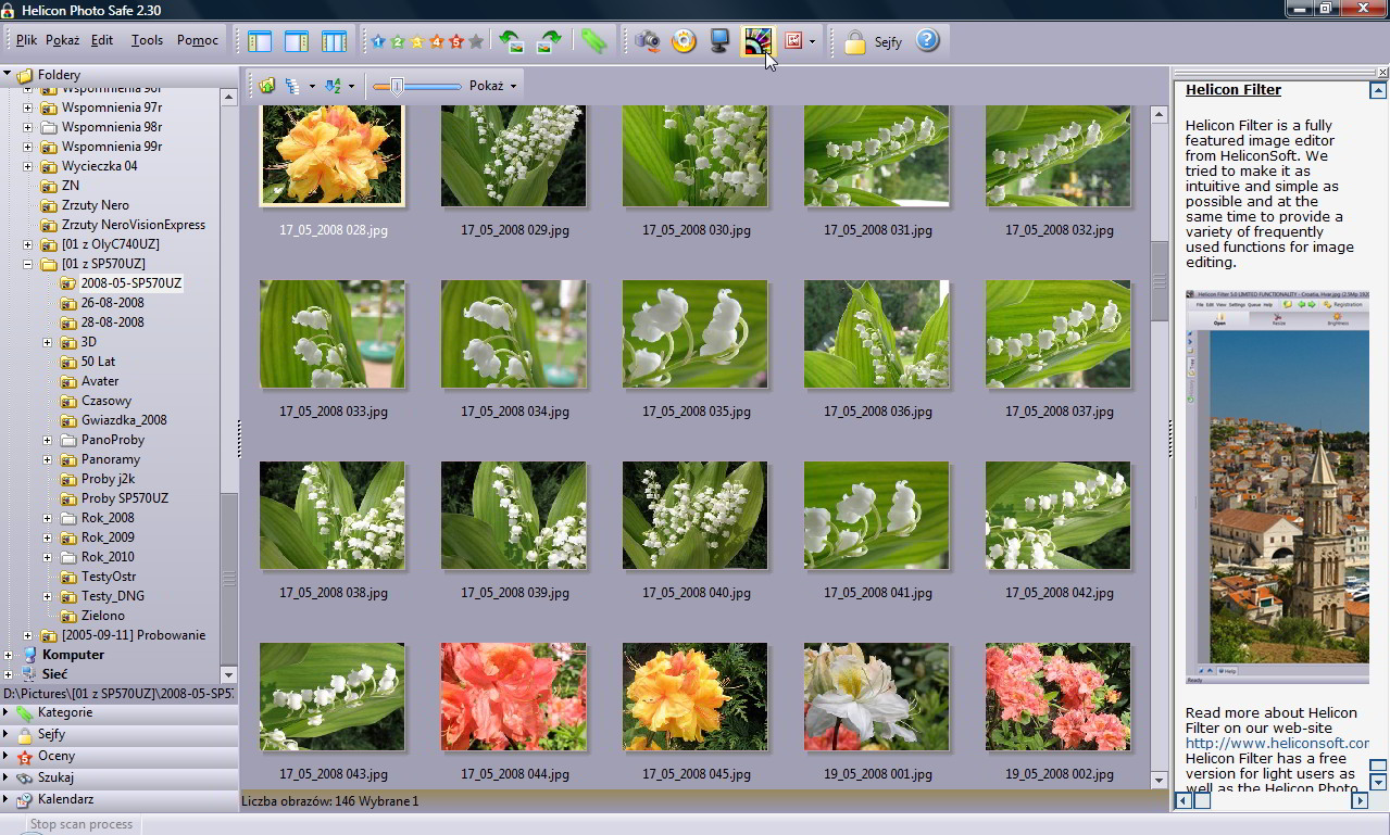 Również Helicon Photo Safe 2.30 (od 04.03.2010r) jest całkowicie free. Można otwierać przy pomocy menu kontekstowego Windows Explorer, możliwość zapisu na dysk CD i DVD, można obrazy szyfrować hasłem ZIP, teraz zintegrowana z Helicon Filter. Interfejs także w j.polskim.