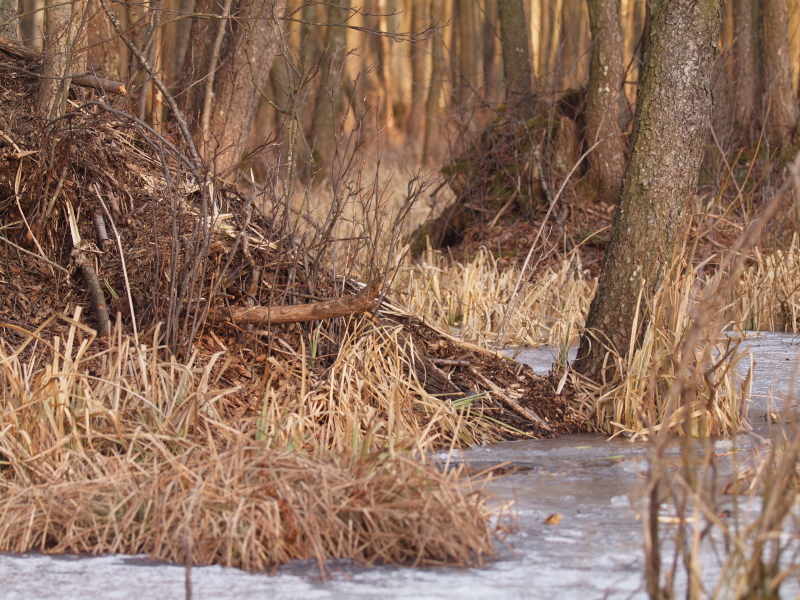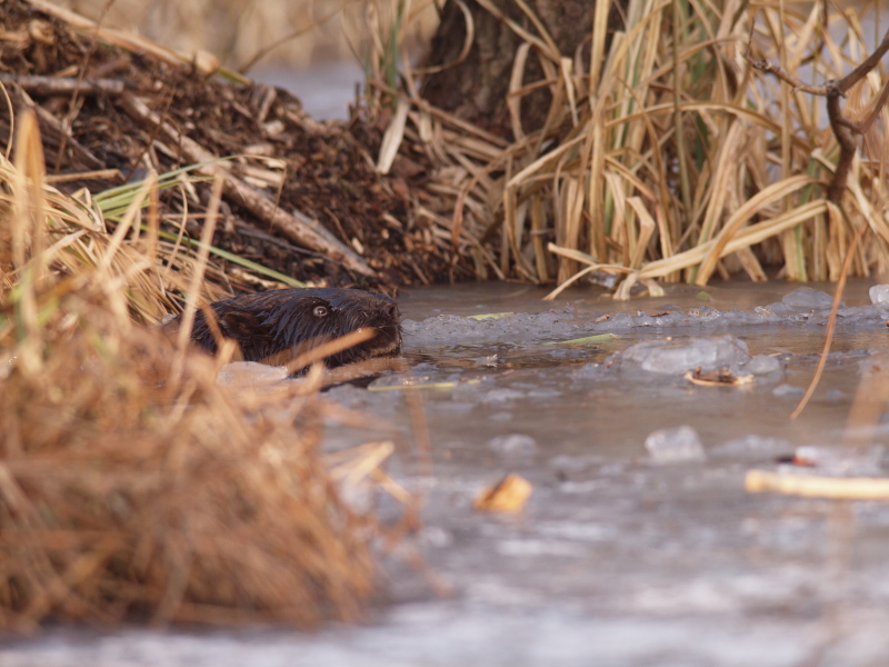 zima nad Biebrzą nie odpuszcza. Lód nocami trzaska jak na Sylwestra. Fajnie można bobry fotografować, niekoniecznie na rzece. Jako, że gatunku u nas mnogo, to zajmuje przeróżne siedliska, w tym rowy melioracyjne. Żeremia duże ( około 2,5m wys.) widoczne z daleka. Zwykle do 5-8m od żeremi są wygryzane dziury w lodzie, skąd gryzonie wychodzą na lód. Chrobot siekaczy słychać już z daleka, tak coś z 30-40m. I wtedy można podchodzić. Jeżeli bober wyjdzie na lód to drgania lodu przenoszą się bardzo dobrze i niestety już ze sporej odległości do niego docierają. Chowa sie wtedy błyskawicznie. Dziś przydybałem ,,na słuch" jednego w olsie. Dwa podejścia robił zanim wyżarł dostatecznie dużą dziurę. Potem zniknął na 15 minut, ale wrócił i wyszedł na chwile na powierzchnię.