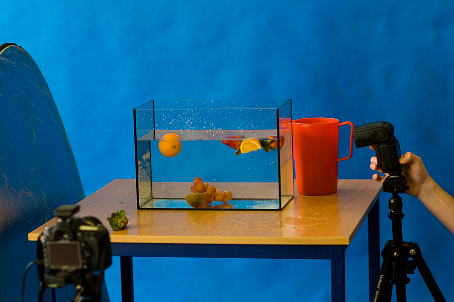 Jak już wszystko zostało rozstawione we właściwych miejscach wziąłem się za robienie zdjęć. Zostało wykonane to poprzez wrzucanie obiektów do wody i za pomocą wężyka spustowego wyzwalanie migawki w aparacie (czas naświetlania ok 1/160 a przysłona ok f/11). Jak się można domyślać, aby uzyskać pożądany efekt, należało wykonać wiele zdjęć metodą prób i błędów i tak też to odbywało się w tym przypadku.