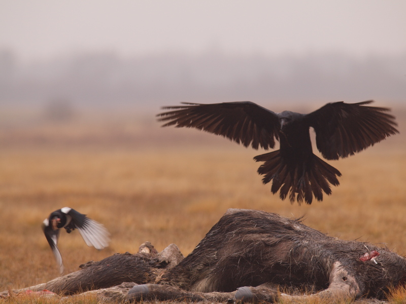 Znaczy, cośkolwiek trzeba na karcie przywieźć. Przed drugą kruk jakby poganiał za bielikiem ( wniosek z głosu) ale po chwili tokował na gałęzi za budą. Bielikowej mu się zachciało? Pewnie lubi duże...Po 15 minutach cielsko bielika zwaliło się na łąkę parę metrów od łosia. Ja zamarłem z dymem w płucach - on gapił się wokoło z niezbyt inteligentnym wyrazem ..dzioba. Status quo trwał z minutę po czym orłań jeden podlazł do łosia, a ja przylepiłem się odetchnowszy do wizjera. Dalej poszło migiem. widać było po nim, że jeszcze jeden jest w powietrzu. Doleciały jeszcze dwa. Same młodziaki. Nażarły się do bólu. Na koniec zasiadł jeszcze gość spod Kowna ( jedyny zaobrączkowany). Podjadł i poleciał. O 16tej wylazłem i pokiwałem się do padlinolotu. 7 godz bez strzału, potem szał. Fotografia to jednak morze stresu. i ocean radości