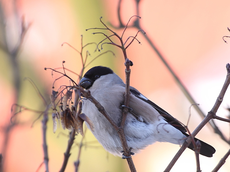 Gile zwiastują nadejście wyżu wschodniosyberyjskiego i tęgich mrozów. Pojawiły się w tym roku mniej więcej dwa tygodnie temu. Spotykam je tylko w jednym miejscu, na wysokich klonach, mniej więcej o 8.30 - grzeją się we wschodzącym słońcu i skubią nasionka przez 15-20min a potem odlatują. Domyślam się, że gdzieś w okolicy musi być stary sad ze zmarzłymi jabłkami. Spotkanie nie jest jednak regułą, dziś np. nie pojawiły się, a planowałem popracować jeszcze nad samczykiem. Zdjęcia nie łatwe, w gałęziach, tło zupełnie przypadkowe zależy gdzie sobie przysiądą (manewru zero).