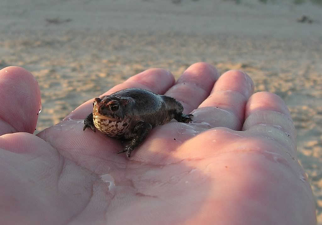 Do wyboru mamy trzy ropuchy, bo tyle występuje w kraju, tylko jeden gatunek składa jaja również w słonej wodzie, jest to ropucha paskówka do tego występuje na wydmach, zielona to z pewnością nie jest, ta na zdjęciu bardziej przypomina mi ropuchę szarą ale co ona by tam robiła?