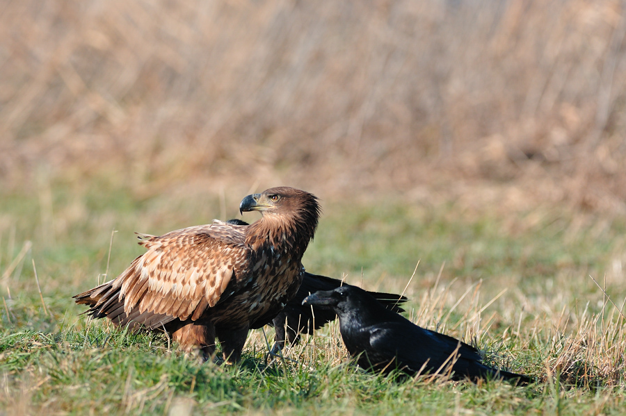 się 30-40 kruków które krok w krok łażą za bielikami