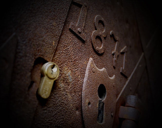 Pierwsze co mi się rzuciło to zestawienie zabytkowego zamka, okucia z nowoczesną wkładką do zamka. Ot fajnie wypatrzone. Ale od razu denerwuje mnie nieostrość wkładki, która na nieszczęście pałęta się w okolicy mocnego punktu. Moim zdaniem wkładka powinna grać na tej fotce pierwszoplanową rolę.