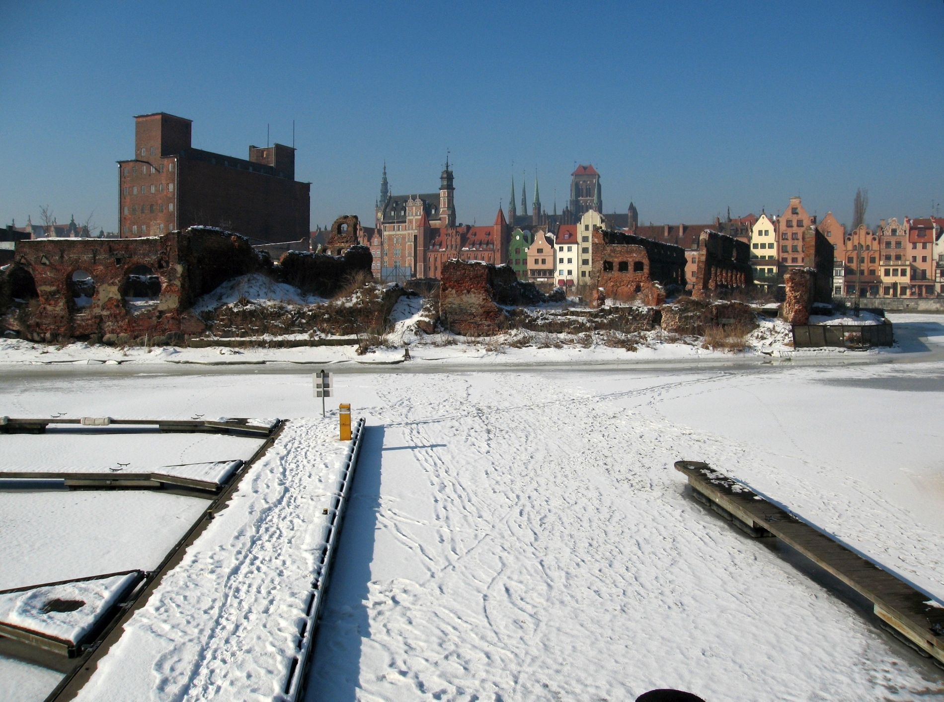 GD186. Widok przez zamarzniętą Motławę na Wyspę Ołowiankę. Po lewej filharmonia, po prawej Spichrz Królewski. Przed spichrzem brak nabrzeża. Stan z 2011 roku. Teraz jest przed tymi budynkami porządne nabrzeże cumownicze z trasą spacerową dla turystów i fotografów