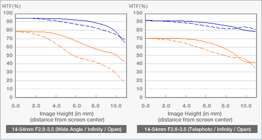 ZD 12-60 przy 12mm wydaje się lepszy (bardziej płaski wykres) niż ZD 14-54 przy 14mm (im dalej od środka tym bardziej opada)