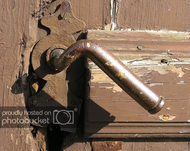 Z klamką, to jest sytuacja zastana. To urzadzenie i płaszczyzna drzwi są usytuowane do slońca w ten sposob, ze nie sposob osiagnac dobrego cienia klamki i jednocześnie dobrej faktury farby na drzwiach o żadnej porze dnia i roku. Mozna miec tylko jedno albo drugie. W tym czasie, gdy bylem przy drzwiach, jako tako do przyjęcia byla faktura, cień klamki byl zbyt kompaktowy, mimo to wykonalem fotkę.
