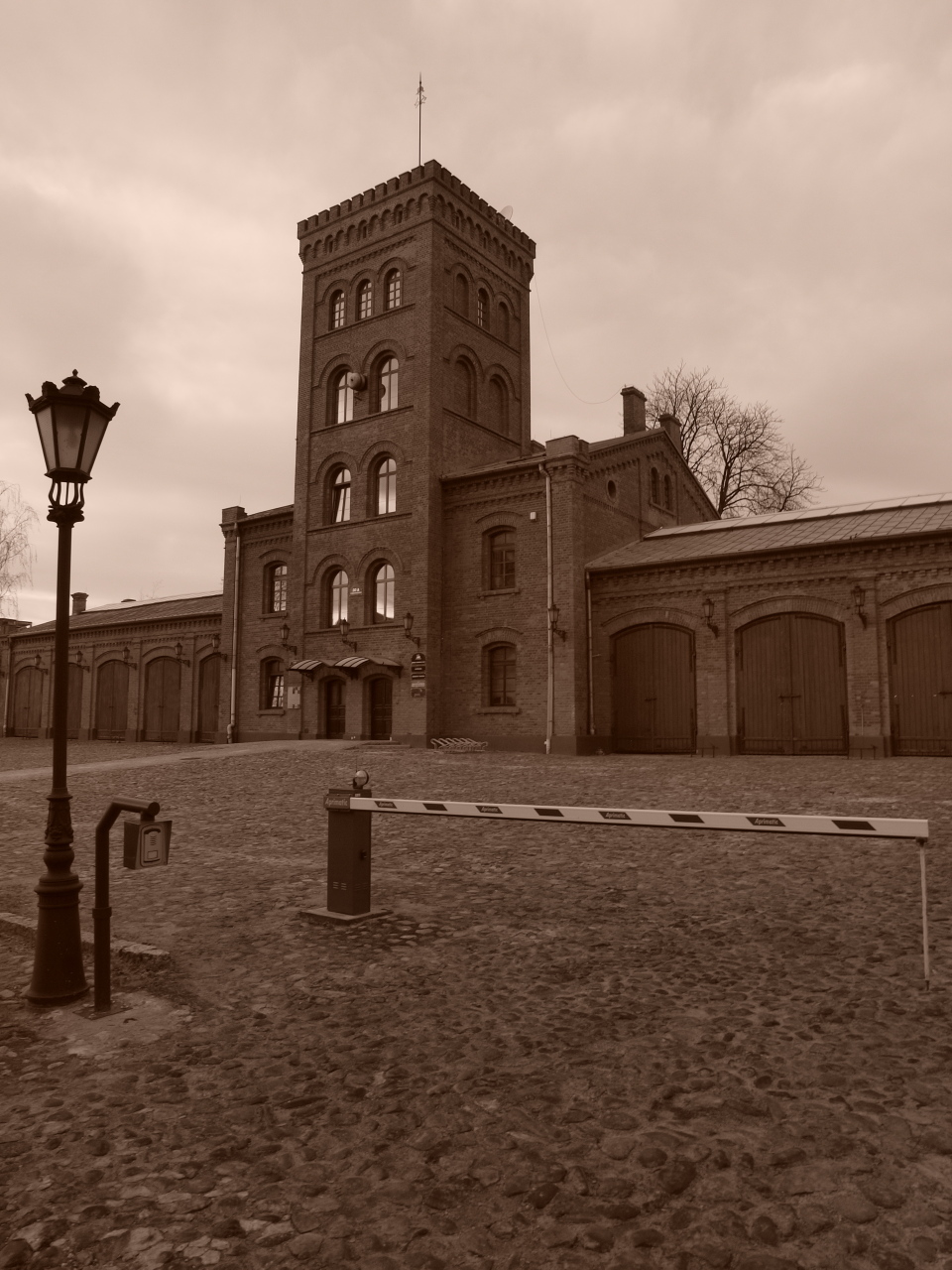 Po wizycie w ruinach dotarłem do remizy, ale coś mnie podkusiło, aby zajrzeć na jej zaplecze. Wszak jak mówią księgi historyczne o tym miejscu, za budynkiem znajdowały się stajnie dla koni strażackich i plac ćwiczeń strażaków. Gdy szarówka opanowywała okolicę a słońce chowało się za horyzont, spotkała mnie niespodzianka. Okazało się że mieszkańcem lokalu za remizą jest mój były kolega z pracy. No i wylądowałem na dachu jednego z budynków a po drodze sfociłem fragment domów za remizą, celując Olkiem w stare okrągłe okno.