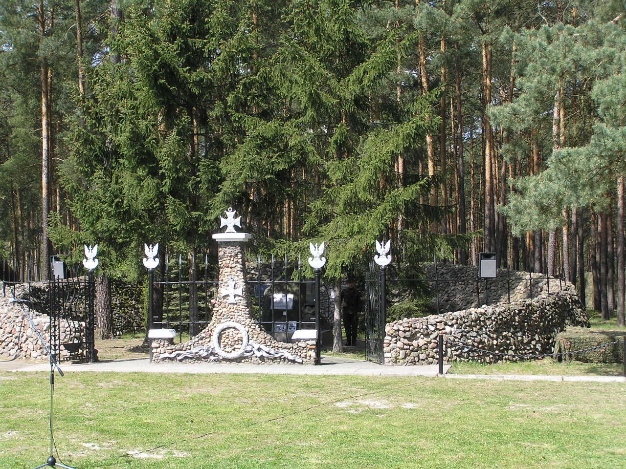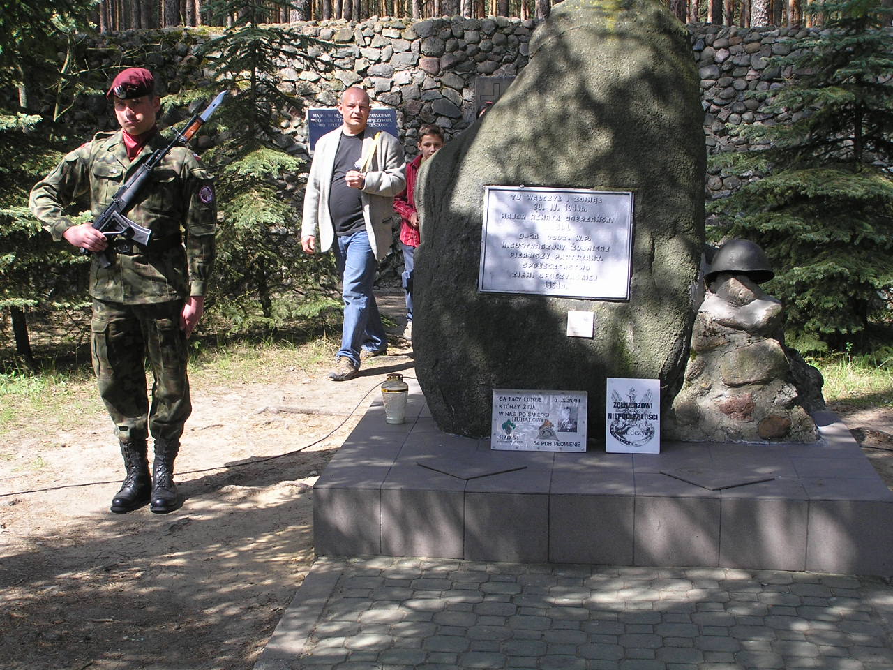 Ok. 10 km. od Inowłodza w kierunku na Radom z trasy skręciłem w drogę pośród lasu. Nie było trudno znależć, bo naprowadzili mnie żołnierze zabezpieczający uroczystość. Gdy dotarłem obeliska, było już "pozamiatane". Telewizja właśnie kończyłą zwijanie sprzętu. Przy obelisku w miejscu śmierci majora Hubala żołnierze pełnili jeszcze wartę honorową.
