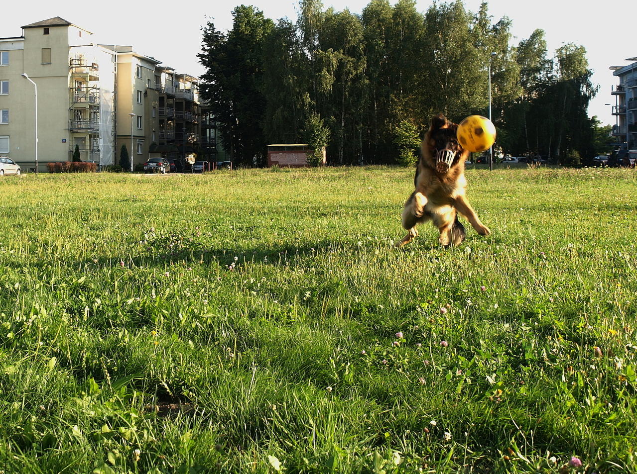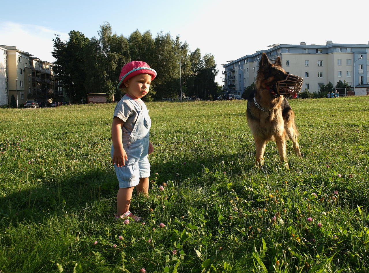 Jak bym mu pozwolił bez kagańca za piłką latać, to te chłopaki by w portki narobiły, a ja bym musiał bez przerwy piłki kupować. O innych ew. problemach nie wspomnę. To zwierzę jest mądre, ale zbyt impulsywne. Wnuczka to mu może po ogonie chodzić, ale na innych dzieciach to ja testować nie będę.
