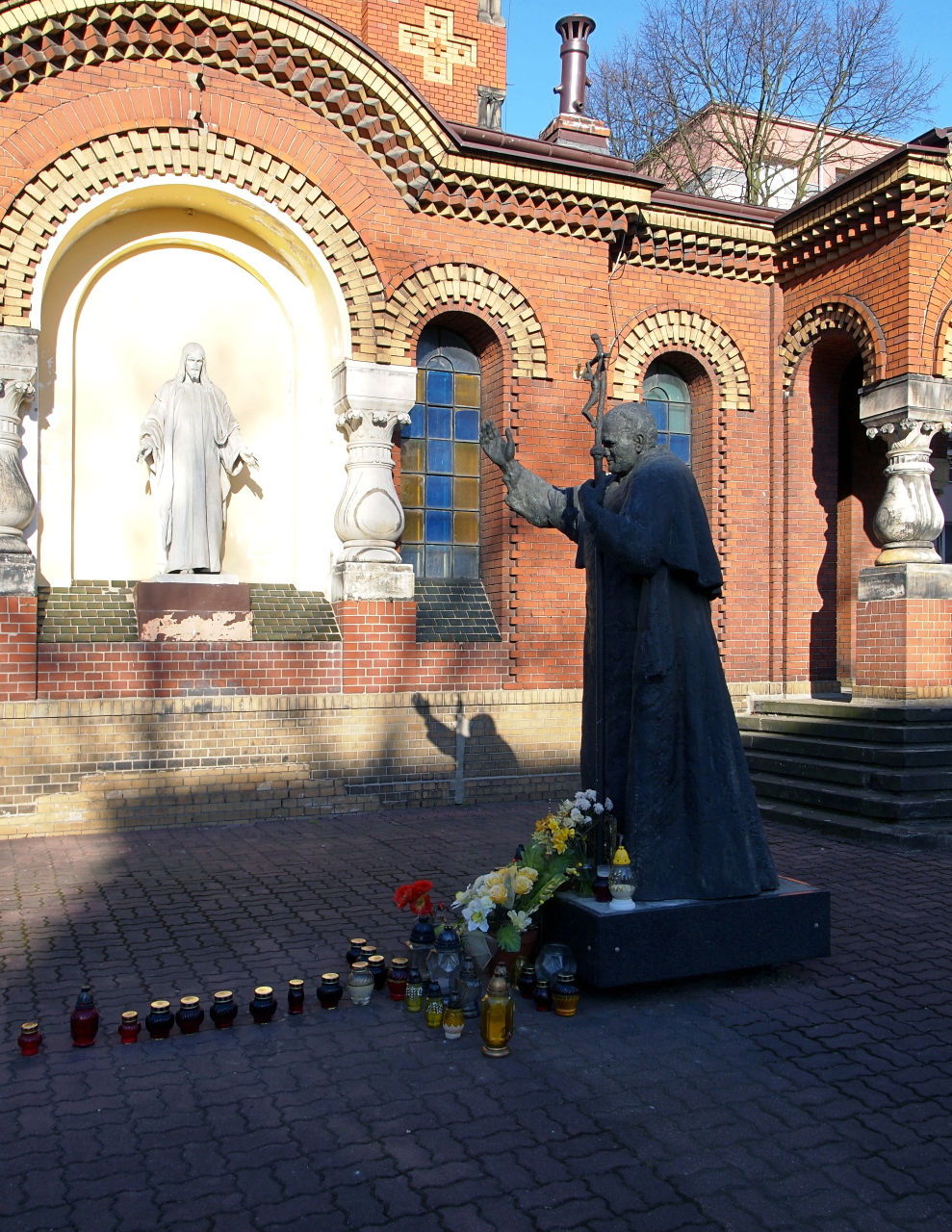 Ta fotka to kadr zrobiony prawie na wprost. Prawie bo za plecami miałem zamkniętą bramę. zaciekawił mnie pomnik papieża przy kościele i.......cień jego ręki na murze. Całe zdjęcie można zrobić tylko z ulicy, ale mur zasłoni sporo kościoła. Więc mam co mam.