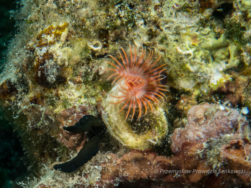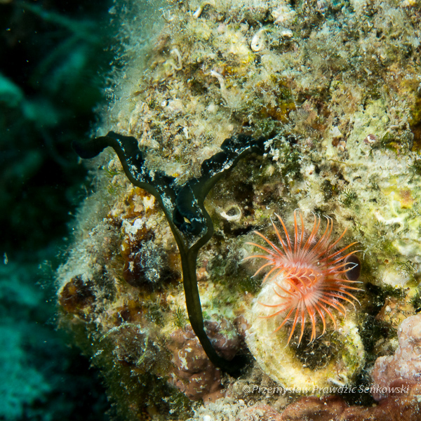 Bonelia zielona (Bonellia viridis) jest to dość często spotykany robal w Morzu Śródziemnym i Atlantyku . Właściwie to trudno zobaczyć w całości bo baryłkowaty tułów jest dość mocno wciśnięty w szczelinę ale często można zobaczyć jej zwijający się w popłochu rozdwojony język, którym poluje. Ciekawe jest to, że język należy do pani Bonelia a pan Bonelia żyje pasożytniczo w jej organie wydalniczym ma 1-3mm i nie ma nawet otworów gębowego i odbytowego. Jednym słowem jest dość mocno zredukowany w stosunku do swojej partnerki