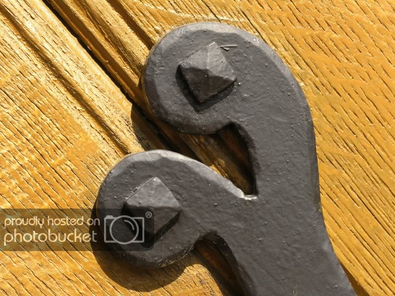 Klasyczny kolor wiejskich drzwi (przynajmniej tak mi sie kojarza). Cienie podkreslaja masywnosc okucia ale nie wiem czy nie za dlugie. Wydaje mi sie ze troche blade, wypalone wyszlo.