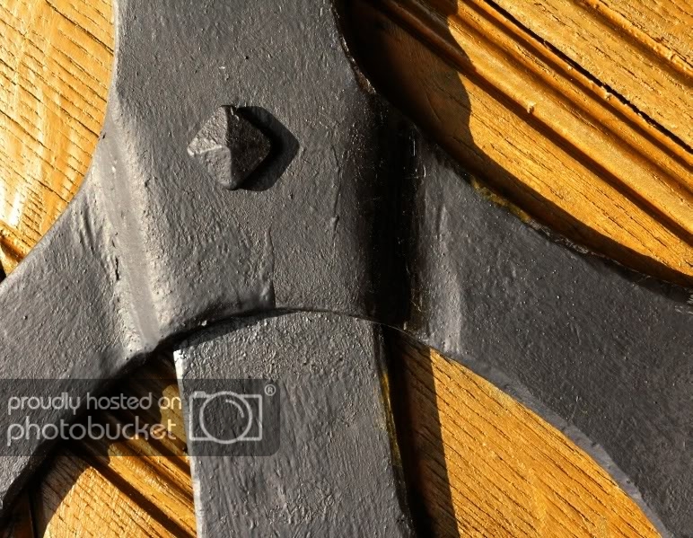Ogólnie rzecz biorąc, to pierwsze co chciałem przedstawić, to prawie graficzna kompozycja – czarny, rozszczepiony pas okucia zwieńczony dwoma kołami oraz w ich centrum dwa łby gwoździ z płaszczyznami piramidek. Wszystko na jaskrawym tle. Gdyby tło było ciemne, spatynowane, to kompozycja by, moim zdaniem, stała by się mniej ciekawa, mniej by byłoby w niej grafiki.