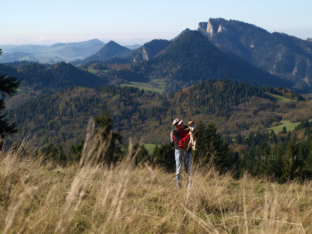 Poniżej narzeczona w tle z Beskidem Sądeckim, Fafik i wujka nogi oraz wujek z Fafikiem na tle Pienin Właściwych lub jak kto woli Pienin Środkowych. Taka ekipa była. Kompletnie inna od tych do których przywykłem