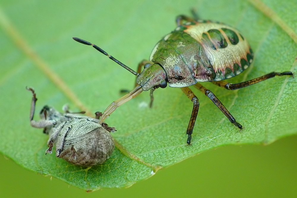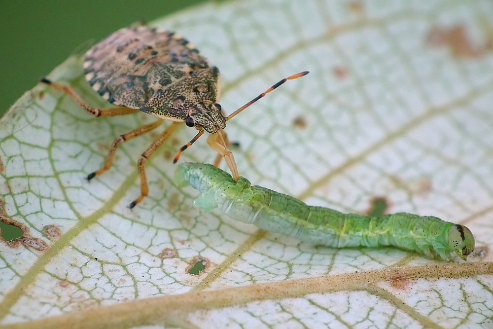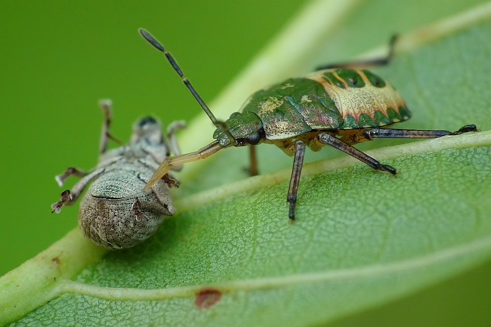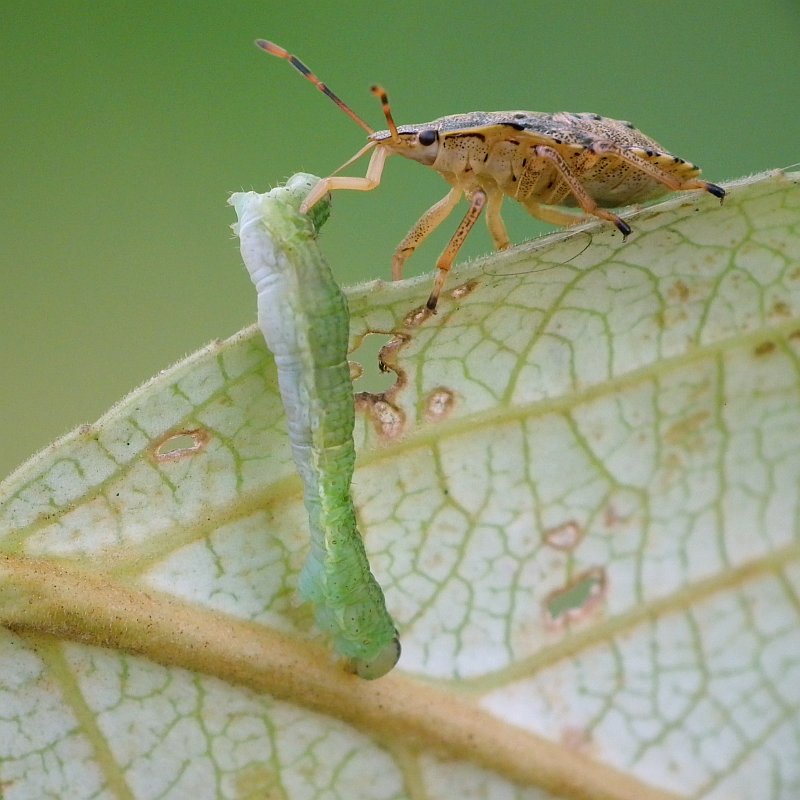 - i dwa kadry larwy pluskwiaka z rodziny tarczówkowatych wysysającej schwytana gąsienicę: