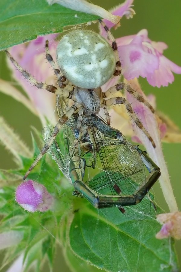 - krzyżak dwubarwny (Araneus marmoreus) ze schwytaną ważką: