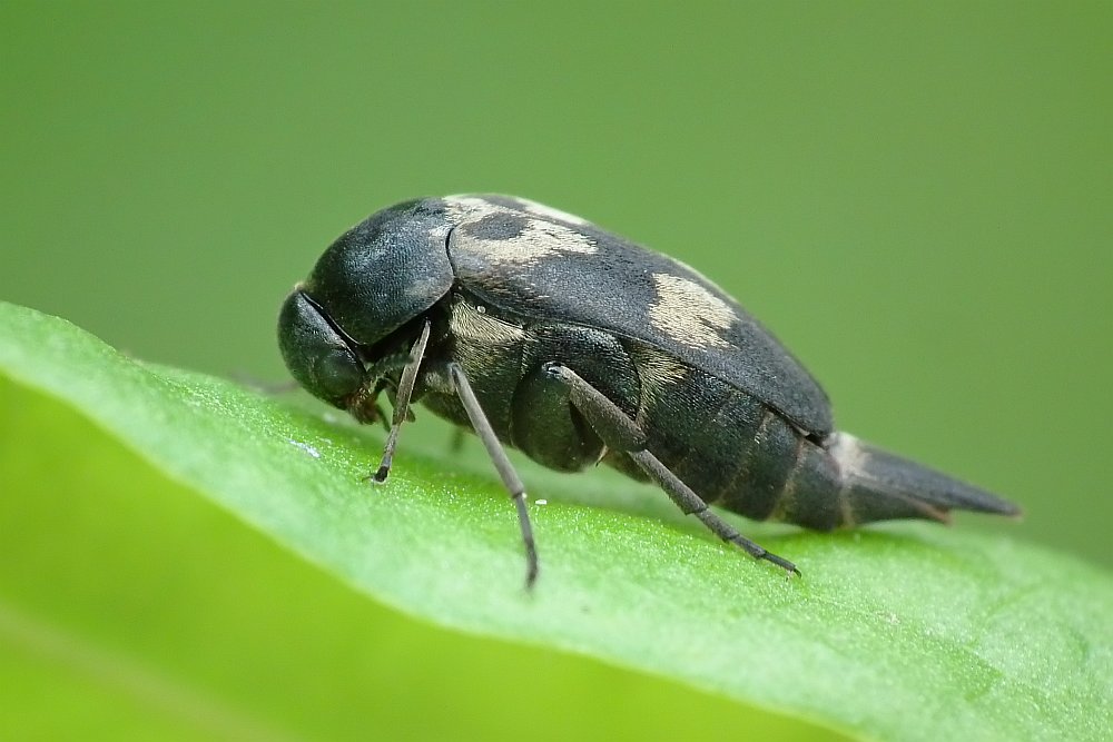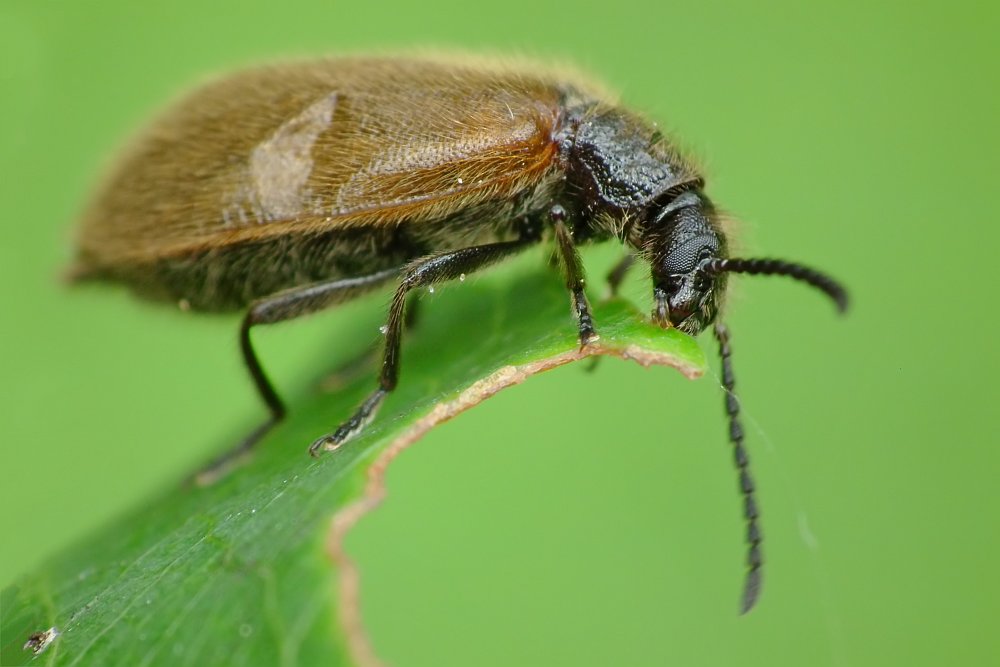 - Maleńki włochaty chrząszcz - omięk - z dziwnym wgnieceniem na pokrywie skrzydła które jednak chyba wcale mu nie przeszkadzało: