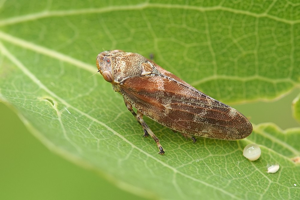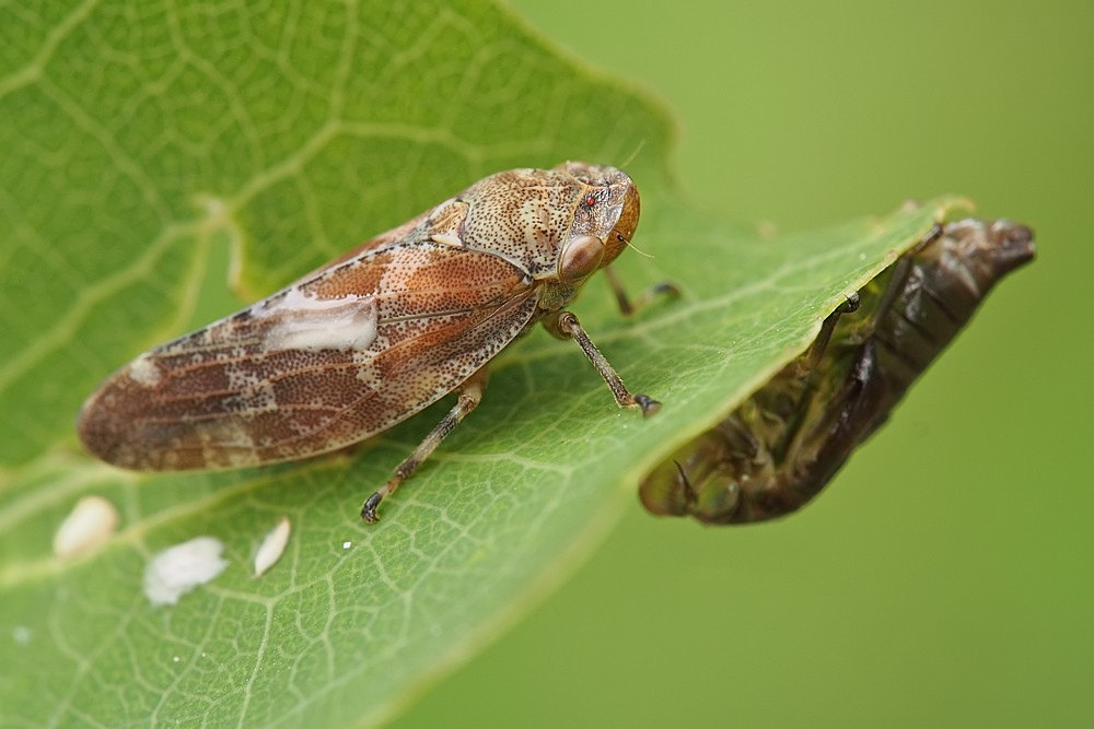 - spojrzenie pod innym katem wyjaśnia sprawę - pod liściem widać pozostała po przeobrażeniu wylinkę, te kropelki oraz biała ciecz na pokrywie skrzydła to też jakieś pozostałości po przeobrażeniu:
