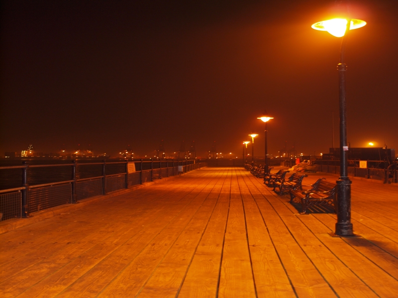 Zdjęcie pomostu oświetlonego pomarańczowym światłem lamp sodowych wykasowałbym z pamięci aparatu. Oprócz błędów kompozycji, brakuje mu też ostrości. Rozmycie można wytłumaczyć, ale braku ostrości spowodowanego nieprzygotowaniem do wykonania zdjęcia (np. brakiem statywu) już nie. Jako ciekawostkę dodam, że wykonywanie zdjęć przy oświetleniu światłem lamp sodowych jest niesłychanie trudne. Proszę zerknąć na widmo takiego światła - posiada ono tylko kilka prążków. Co to oznacza w praktyce? Ano fakt, że bardzo trudno otrzymać zdjęcie bogate w szczegóły - w przede wszystkim w barwy (zresztą jedno z drugiego wynika).