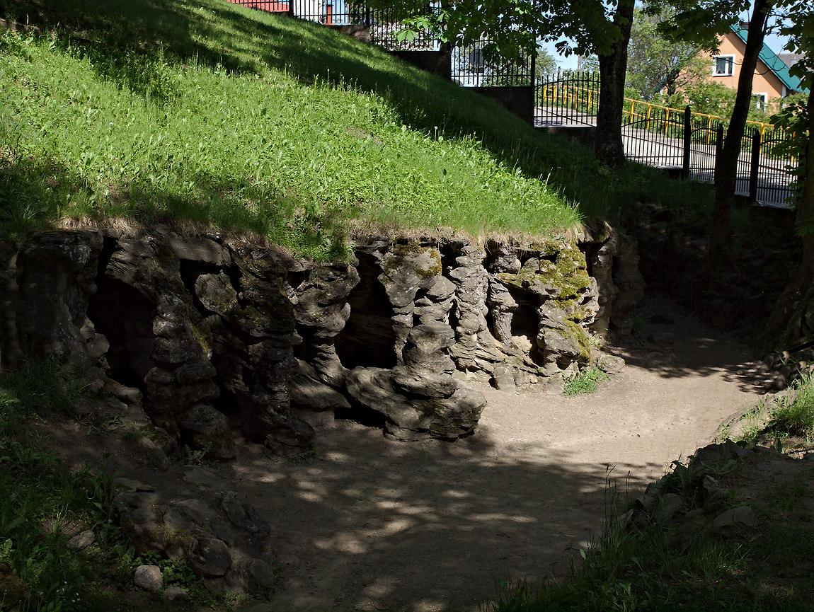 Osobliwość geologiczna. Spomiędzy skał osadowych scementowanych związkami wapnia wypłukany został piasek. Pozostałość tworzy fantazyjne kształty i groty.