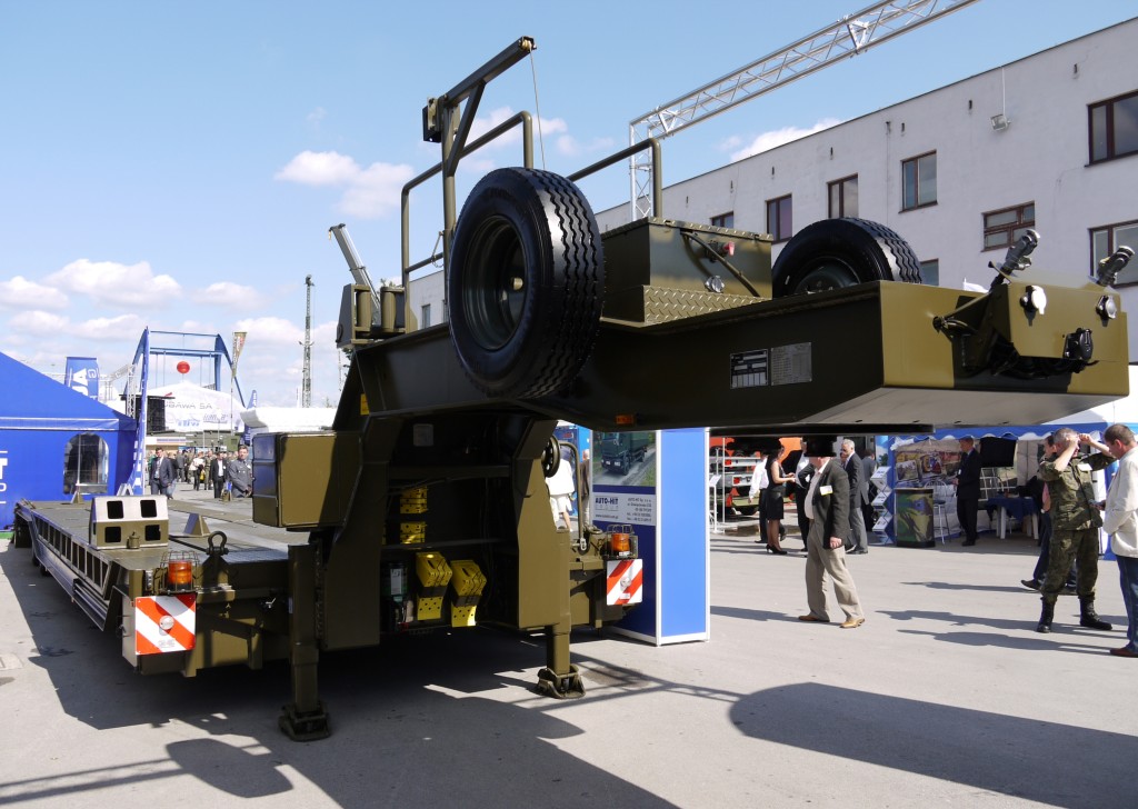 To niskopodłogowa naczepa do transportu ciężkiego sprzętu (np. czołgów). Ta wysoka część na froncie podczas jazdy opiera się na siodle ciągnika siodłowego - musi więc być tak wysoko uniesiona by siodło się pod nią zmieściło. Widoczne u góry koła to koła zapasowe.