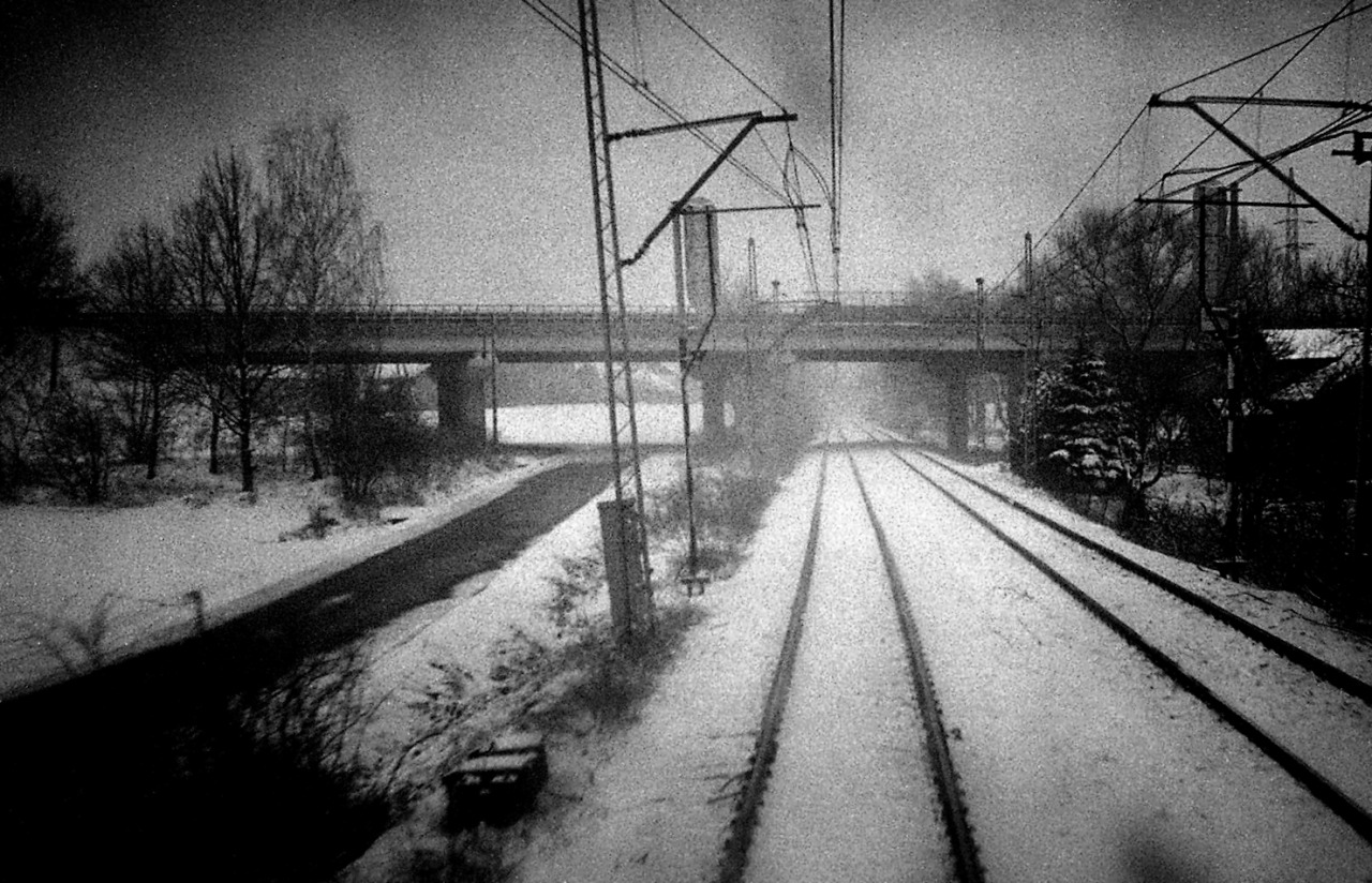 Znalazłem jedno zimowe zza brudnej szyby ostatniego wagonu. Pociąg relacji Zwardoń - Katowice.