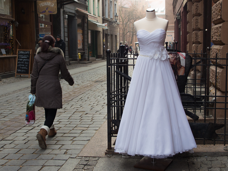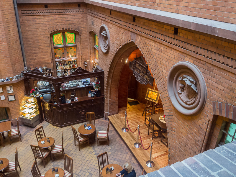Jeszcze na schodach dostosowałem aparat do swoich przyzwyczajeń – RAW+jpg, Auto ISO 100-800, priorytet przysłony. Wszystkie zdjęcia wywołane w LR4.3 RC1, lekko obrobione wg własnych preferencji. Te z ISO 400 i 640 lekko odszumione. Pierwsze zdjęcia zrobiłem przez okno-widok na kafeterię mieszczącą się na dawnym dziedzińcu Dworu Artusa.
