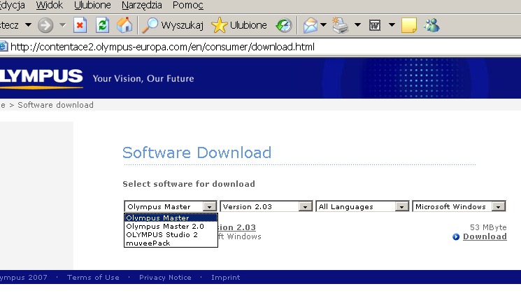 Po wejściu na link dotyczący Olympus Master 2 ( http://www2.olympus.pl/consumer/205_...S_Master_2.htm ) i kliknięciu "Darmowe pobieranie pełnej wersji..." następuje przekierowanie na centralny serwer, gdzie można wybrać nie tylko Mastera, ale i co innego