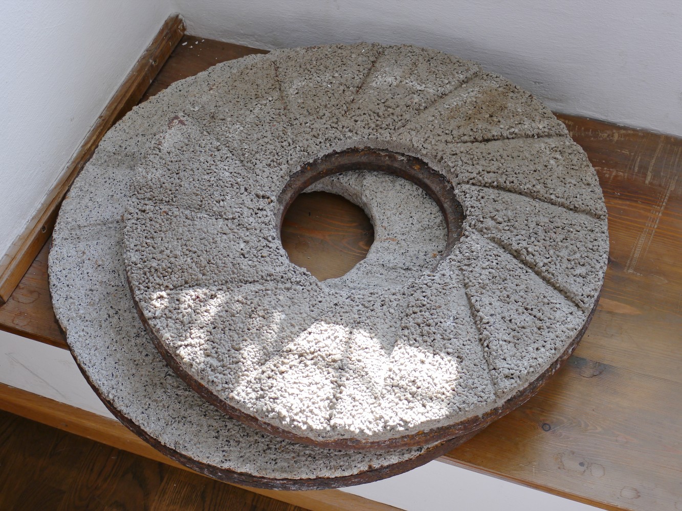 Kamienie młyńskie eksponowane w zabytkowym wiatraku, na terenie parku Sanssouci w Poczdamie.