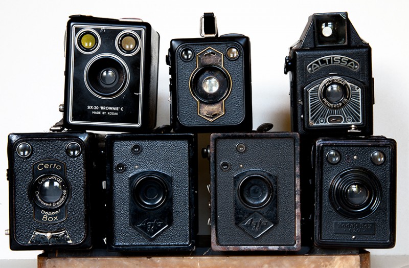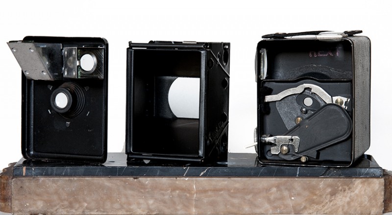 Tak nazwałem swoje aparaty charakteryzujące się specyficznym „pudełkowym” kształtem o bardzo prostej i niskobudżetowej konstrukcji. W zasadzie plan budowy skrzynek był bardzo podobny. To prostopadłościenna obudowa z wizjerami (z reguły były to dwa lustrzane wizjery do kadrów poziomych lub pionowych) i z pokrętłem przesuwu filmu. W komorze, do której można było dotrzeć otwierając tylną pokrywę z czerwonymi oczkami lub przednią płytę z obiektywem(jedno o czasami dwa „szkiełka”) umieszczony był metalowy wkład, do którego ładowano film (z reguły 120 lub 620). Pod płytą przednią aparatu montowany był zmyślny mechanizm migawki i przysłony( jeśli występował) a niekiedy dodatkowe szkiełko soczewkowe pełniące rolę elementu nastaw odległości. Ale może zajrzyjmy do środka.