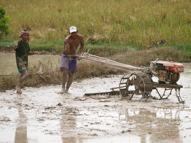 77. Przygotowanie pola bezpośrednio przed sadzeniem ryżu. Czasami woły zastępowane są takimi ciągnikami. Specjalnie zbudowane koła zwiększają przyczepność w błotnistym terenie.