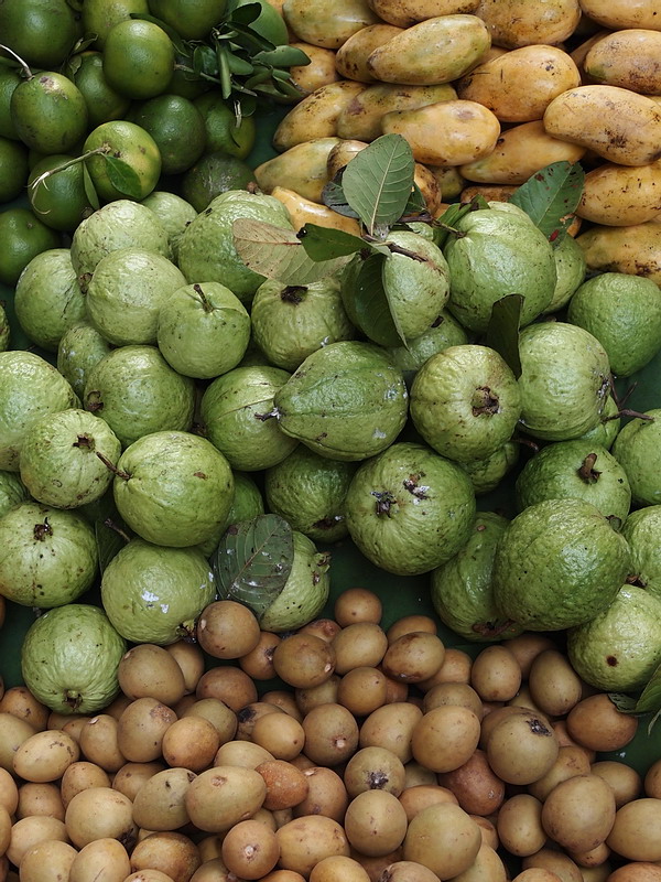 Nie brakuje tanich, miejscowych owoców. Od góry, kwaśne zielone pomarańcze, po prawej soczyste i aromatyczne mango, pośrodku twarda gujawa, na dole słodka sapodilla.