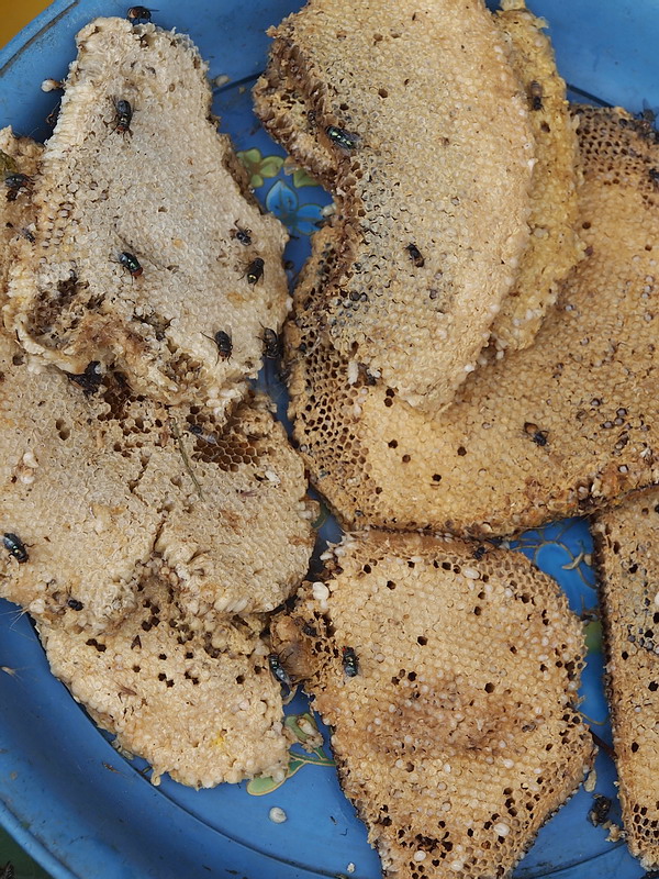 I plastry miodu, pozyskane od dzikich pszczół, zapach niesamowity. Żuje się je razem z larwami.