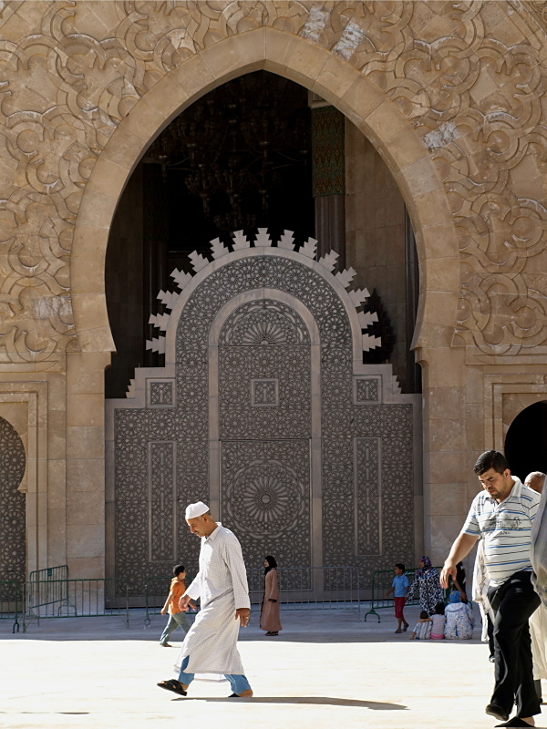 Casablanka znana z z filmu Curtiza, choć żadna scena tam nie była filmowana, jest mało marokańska, takie duże portowe nowoczesne miasto. Meczet Hassana II to chluba całego Maroka. Otoczony z trzech stron wodą z marmurowym minaretem na wys. 175 m. przypomina maksymę z Koranu "Allach ma swój tron na wodzie". Świątynia z otwieranym dachem może pomieścić 20000 ludzi w środku i 80000 na placu. Ten potężny kompleks został wybudowany jako dar narodu dla Hassana II, ojca obecnie panującego króla. Nocą ze szczytu wiązka lasera wskazuje kierunek Mekki, w pokojach hotelowych bywa to znaczek na suficie, ostatnie zdjęcie![]()