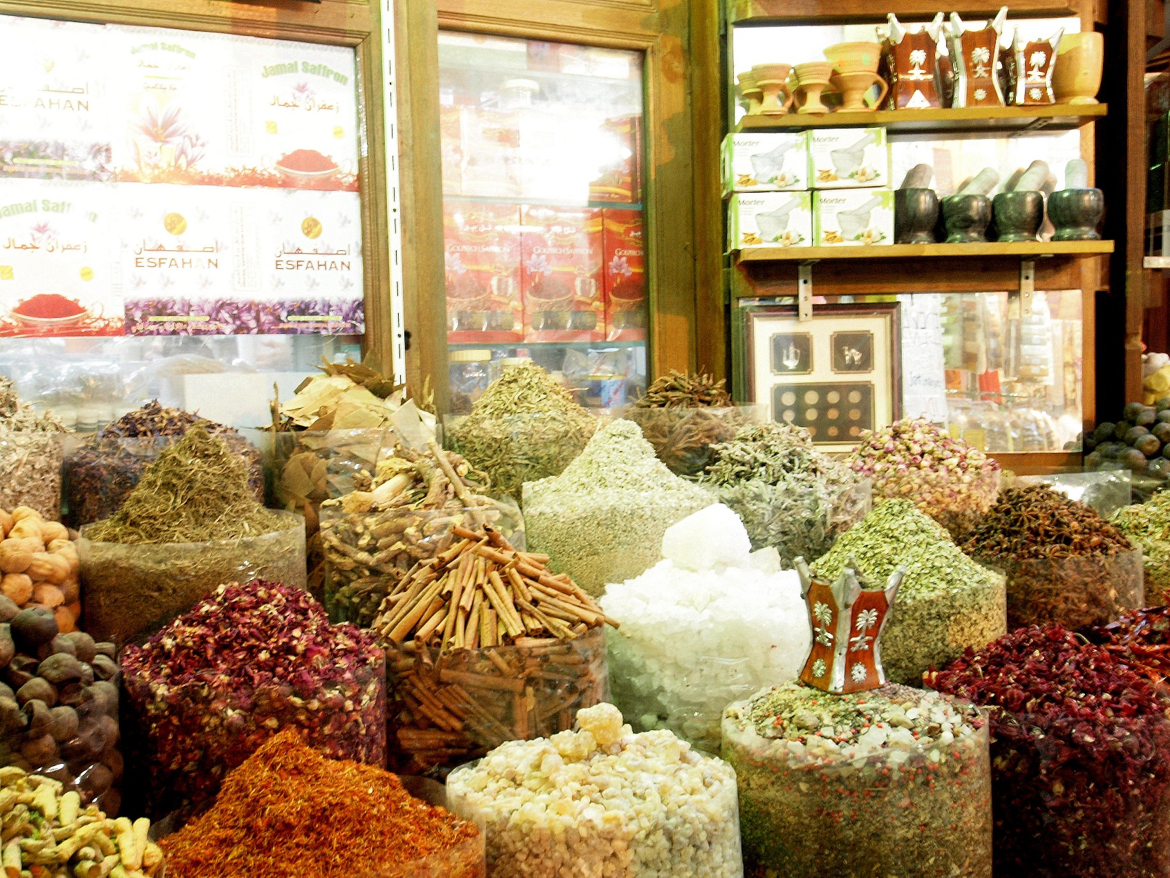 Biedronka w Dubaju.Deira Spice Souk to ogromny bazar w dzielnicy Dubaju Deira, na którym sprzedawane są przyprawy z calego świata. Na początku XIX wieku irańscy kupcy upodobali sobie bazary Dubaju, który stał się dzięki temu jednym z najważniejszych ośrodków handlowych nad Zatoką Perską. Przyprawy są nieodłącznym elementem kuchni wschodniej. Na jednej ze średniowiecznych uliczek, na kilkunastu stoiskach sprzedaje się przyprawy prosto z worków jutowych: curry, cynamon, kolender, szafran i inne aromatyczne zioła. Poza tym można kupić pachnidła, wodę różaną, mirrę, hennę i inne kosmetyki z Iranu, Indii, Pakistanu, Sri Lanki i Zanzibaru. Wyjątkową popularnością cieszy się tutaj kadzidło (substancja żywiczna z kadzidłowca), które jest sprzedawane w workach, podzielonych według jakości. Bazary Dubaju należą do najbezpieczniejszych i najspokojniejszych na całym wschodzie.