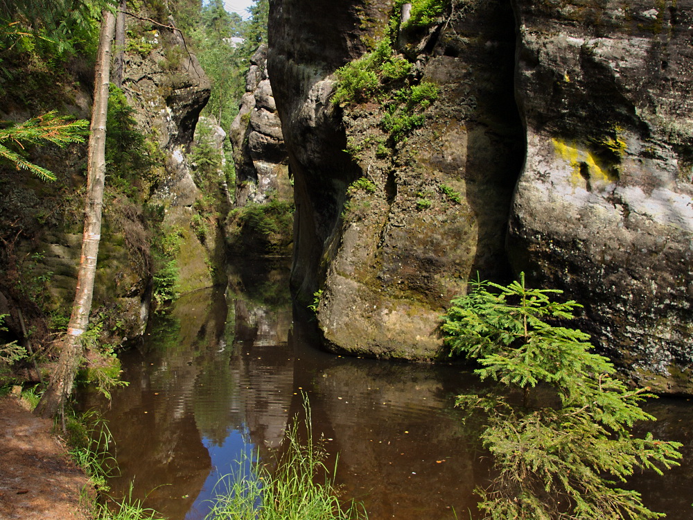 Skalne jeziorko jest na granicy ze szlakiem wokół adrszpaskiego skalnego miasta i po zerknięciu na mapę stwierdziliśmy, że nie ma sensu pchać się ponownie przez Wilczy jar z powrotem w stronę Teplic, gdyż stąd bliżej mamy do wyjścia w Adrszpachu, gdzie możemy złapać pociąg, który kursuje wzdłuż granicy parku.